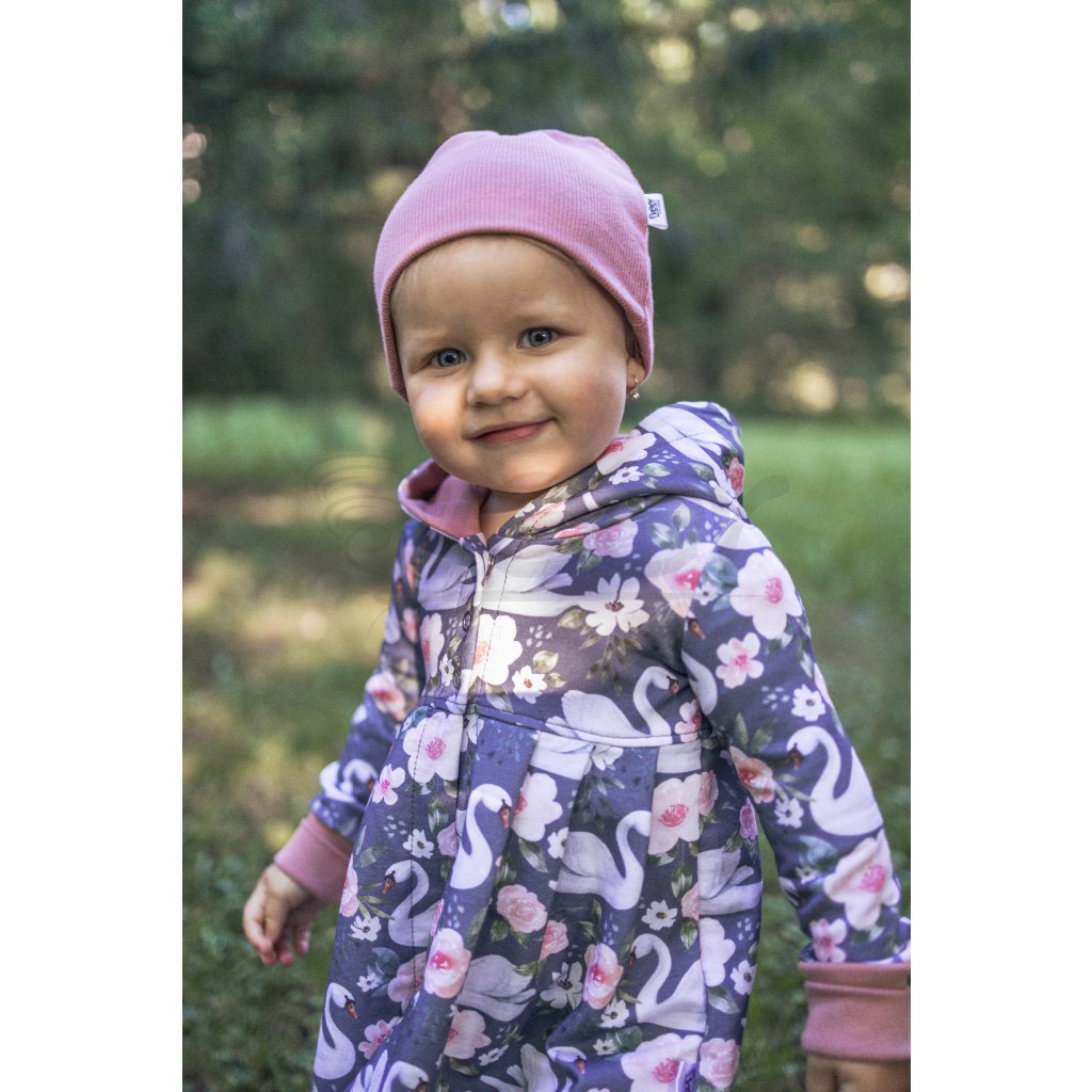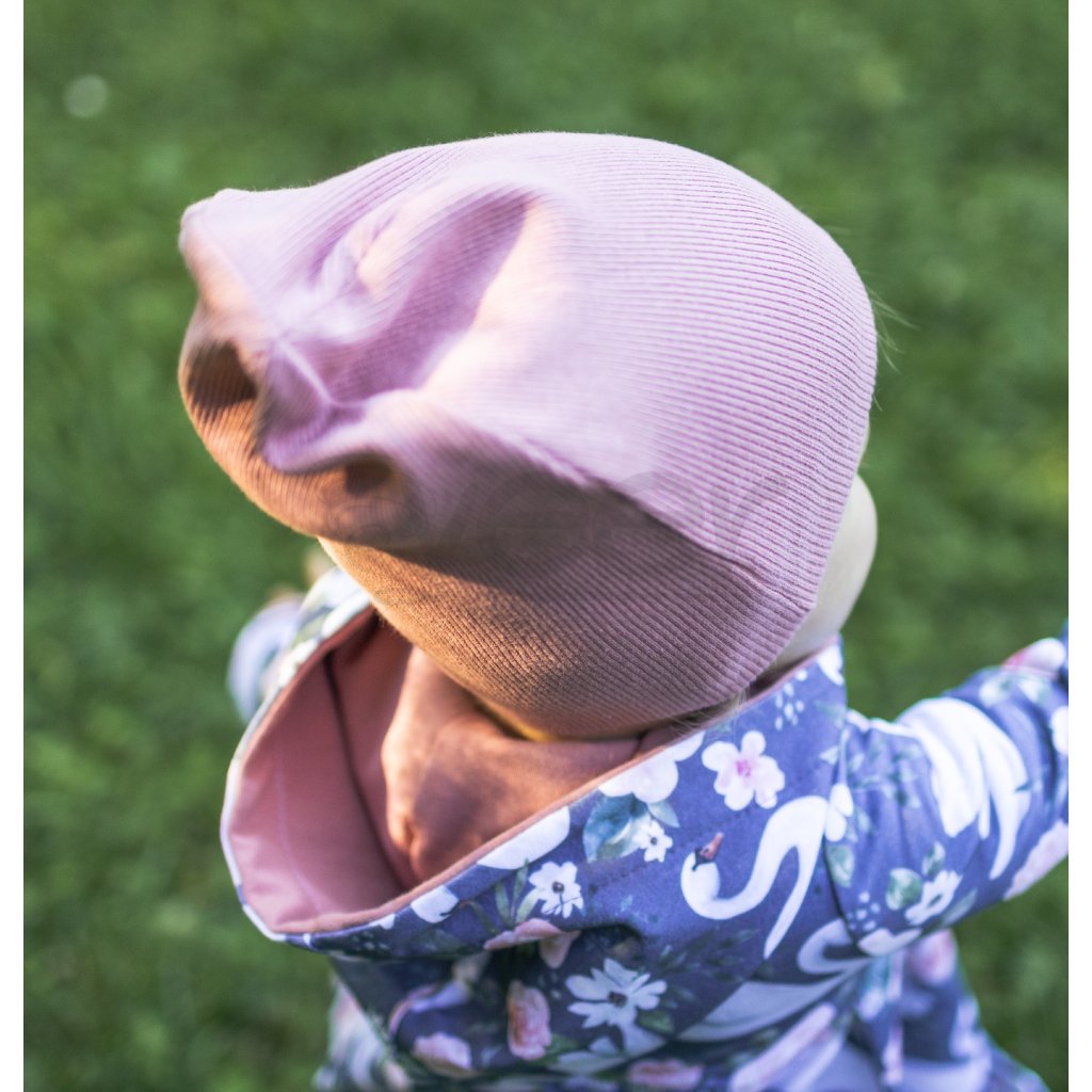Čepice z dvouvrstvého žebrovaného úpletu, vzadu spadlá "na šmoulu" je ideální volba na mírnou zimu, jaro nebo podzim.