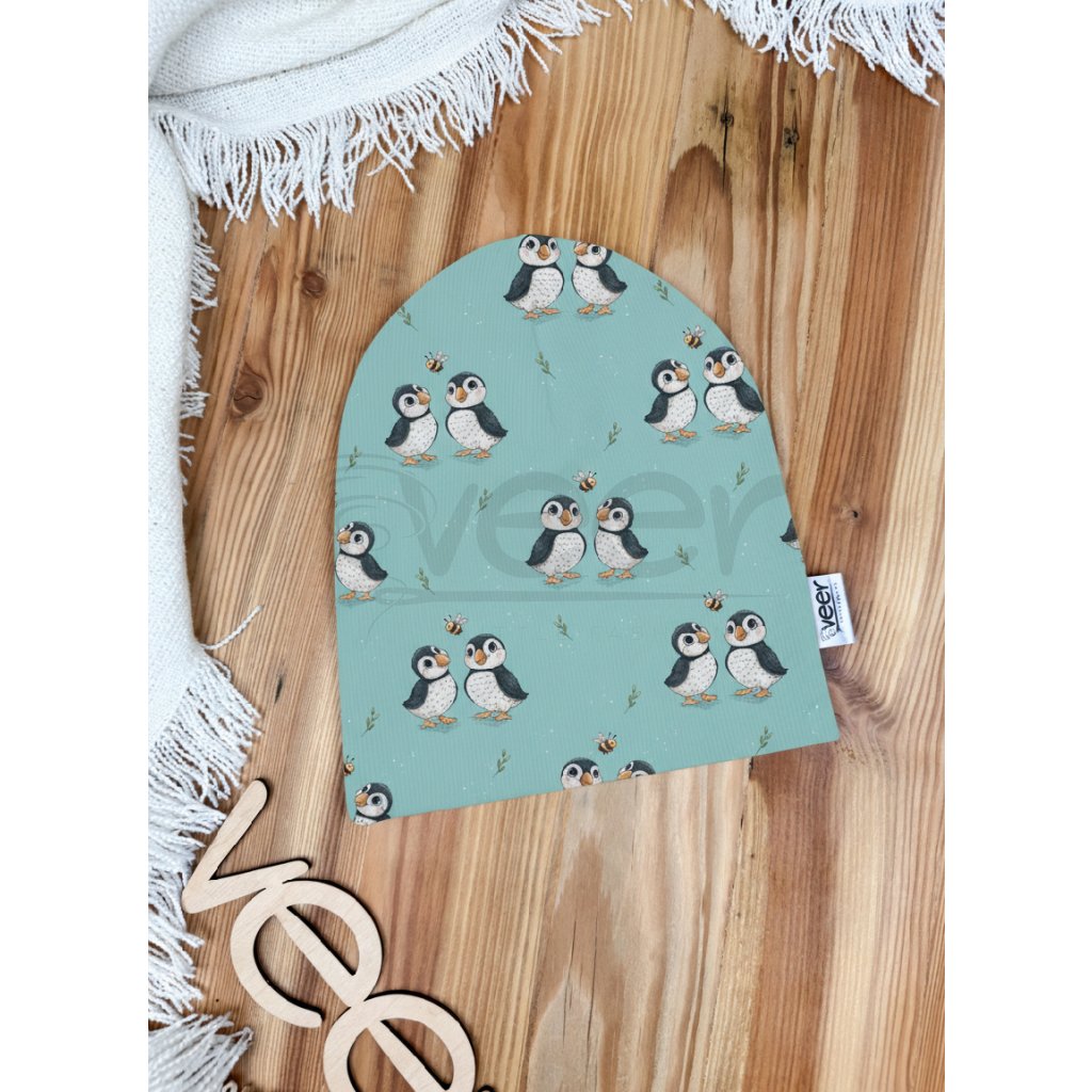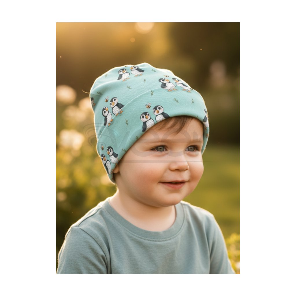Čepice z dvouvrstvého žebrovaného úpletu, vzadu spadlá "na šmoulu" je ideální volba na mírnou zimu, jaro nebo podzim.