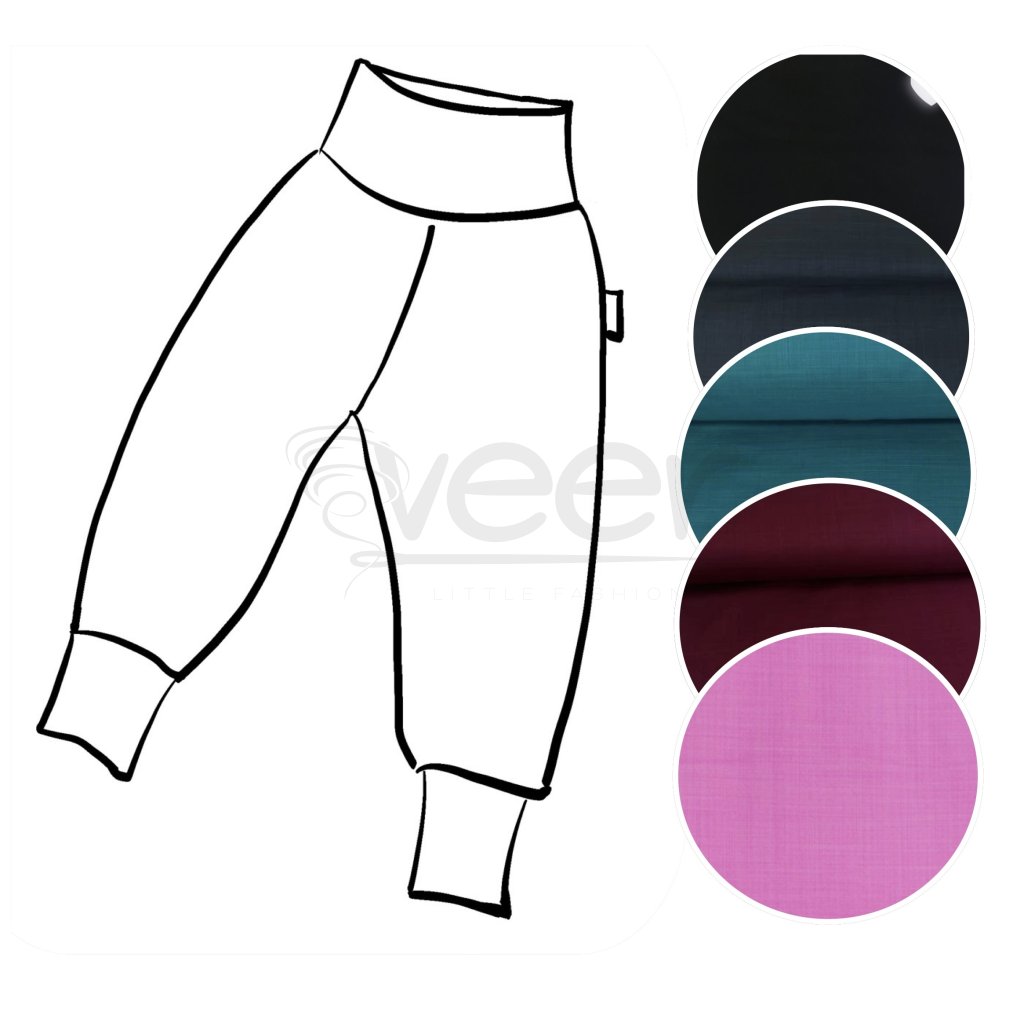 U velikostí 80 - 92 je střih vytvořen pro děti s plenkou normální až lehce baculatější postavy (hubeným dětem budou volné, ale na přání je možné upravit). U těchto velikostí používám v pase širší pružný bavlněný náplet bez gumy.