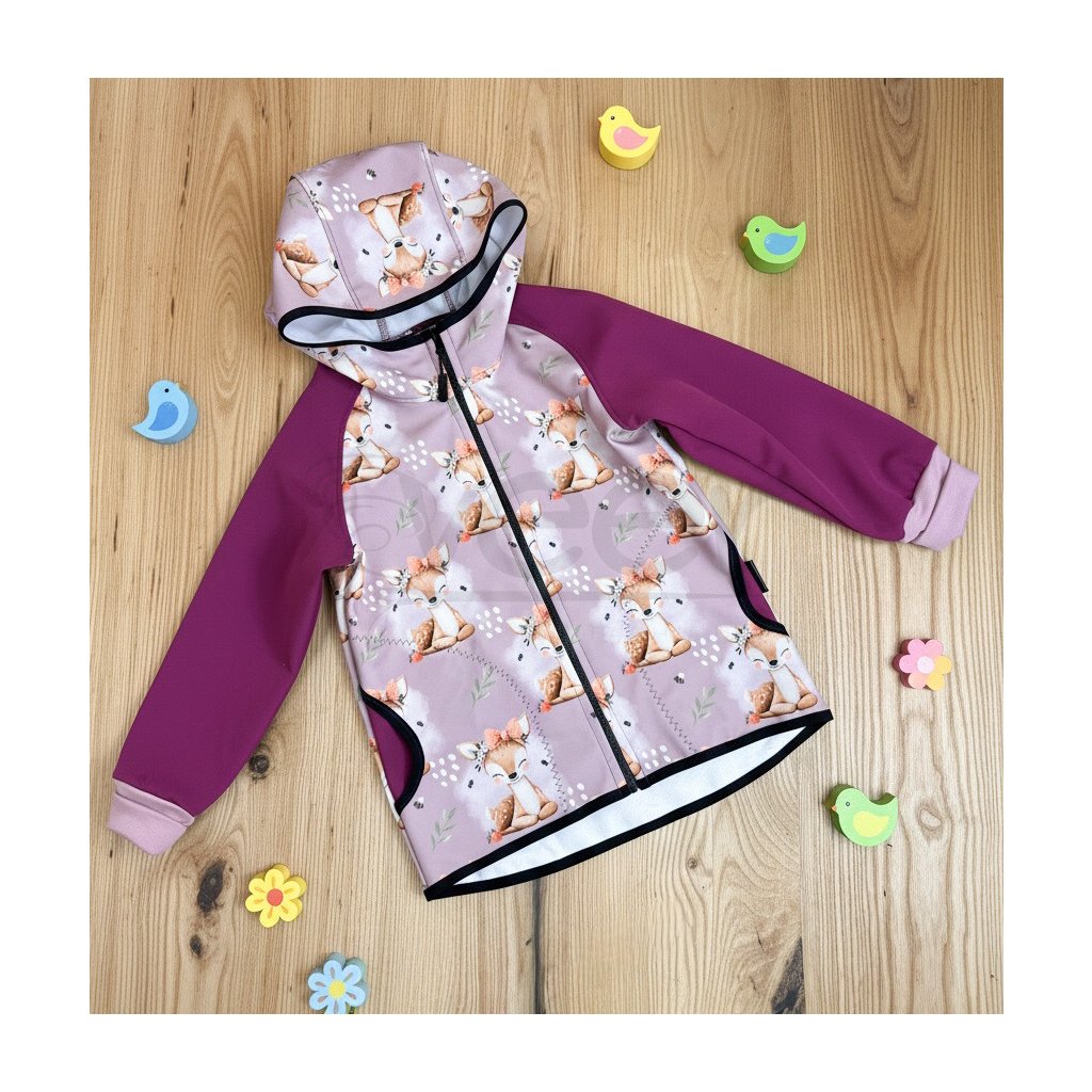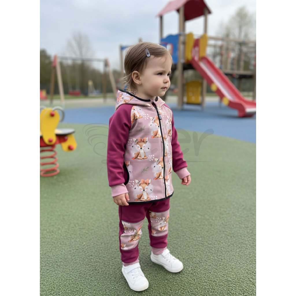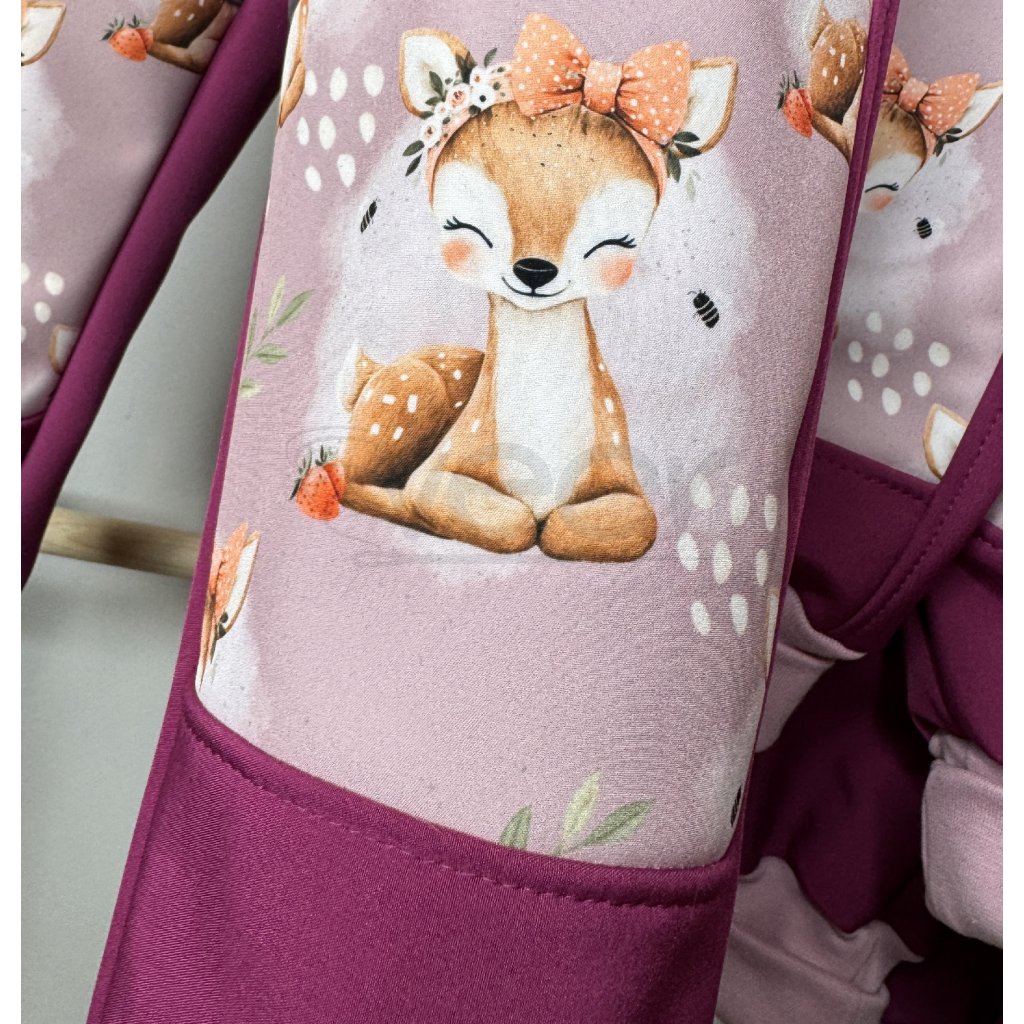 TĚLO A KAPUCE MÁ VZOR SRNEČEK, RUKÁVY JSOU JEDNOBAREVNÉ VE FUCHSIOVĚ RŮŽOVÉ. Náplety na rukávech v barvě DUSTY PINK.